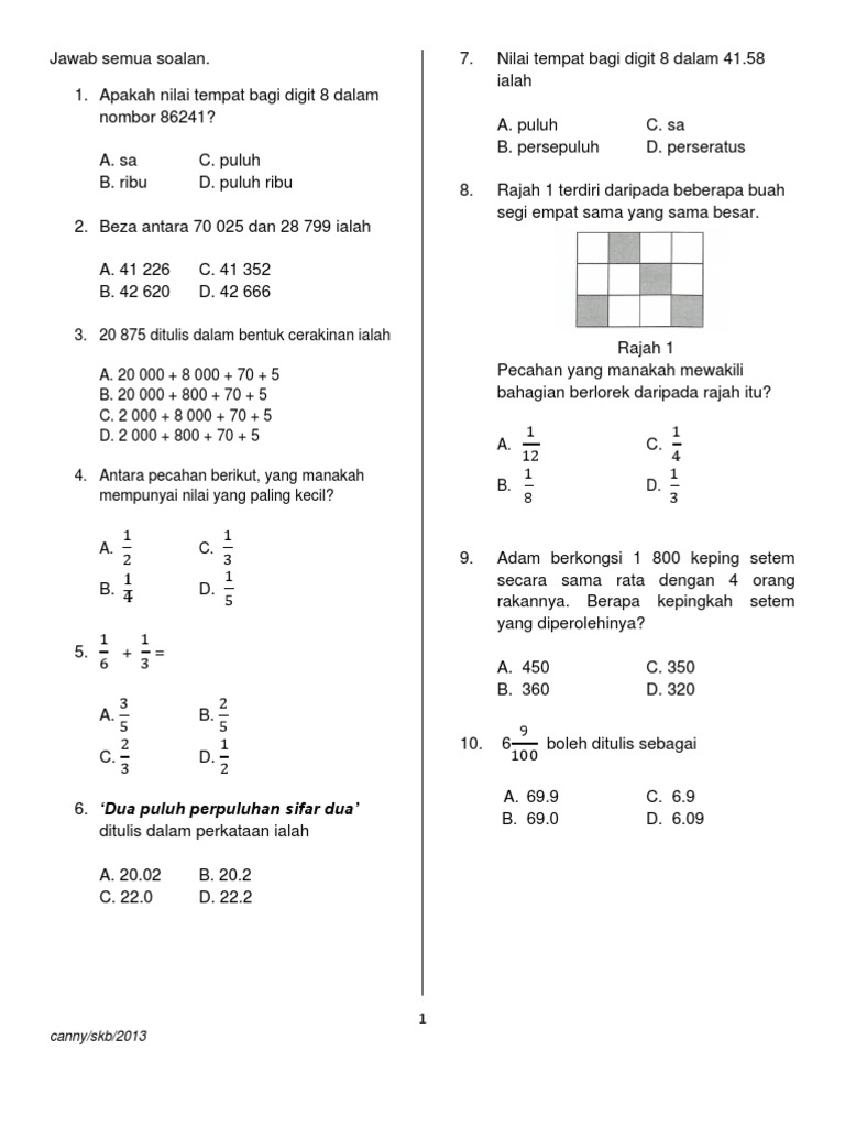 Contoh Soalan Peperiksaan Matematik Tahun 4 W Pogoni Za Ksiazkami
